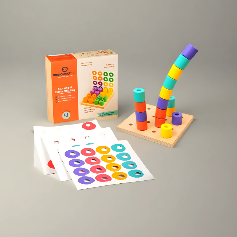 The Wooden Stacking and Colour Matching by Curious Cub is a Montessori-style cognitive development toy for toddlers. It’s a wooden board with pegs of different colors that children can stack, match, sort, and place into corresponding holes. It encourages hands-on manipulation in a durable, natural material build.