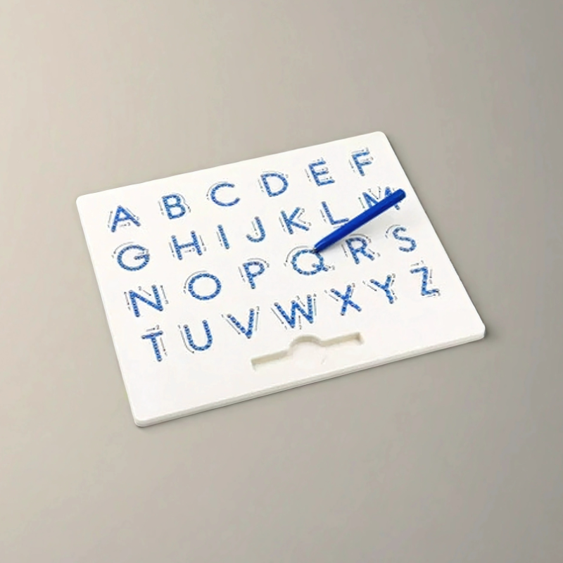 A Mag Pad is a toy designed for drawing and learning letters and shapesIt uses a magnetic stylus to pull up small magnetic beads embedded in the board, creating a raised image or letter when traced. The beads can be pushed back down with a finger or the stylus to erase and start over. It boosts hand-eye coordination, fine motor skill.