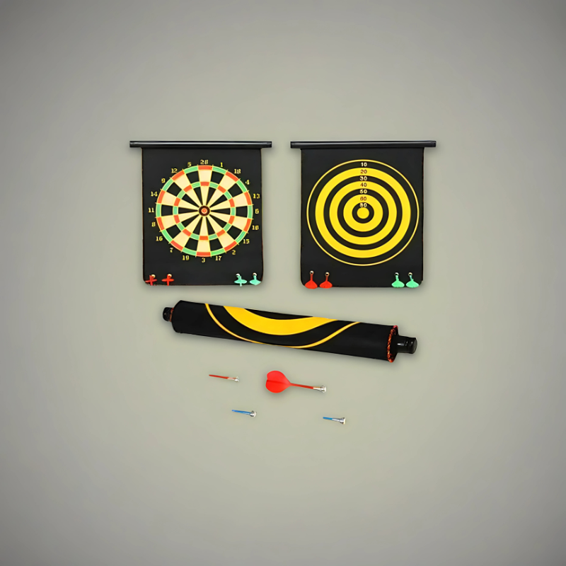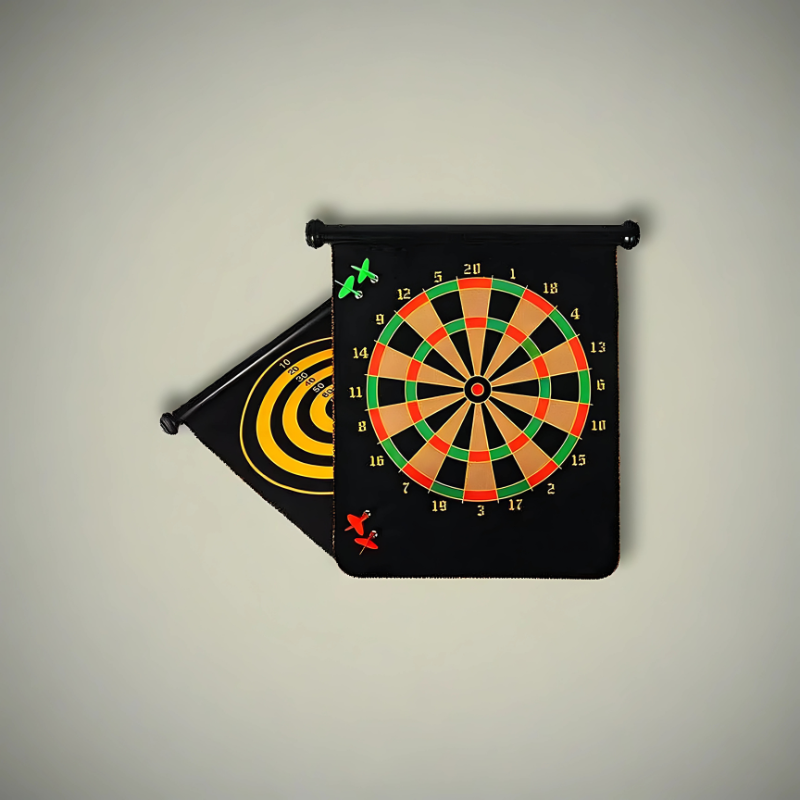 The Toyshine Double-Sided Magnetic Dart Board with Magnetic Darts is a foldable, soft-surface dart game featuring a classic dartboard design on one side and a bullseye target on the other. It includes six safe magnetic darts, offers hassle-free wall hanging, and rolls up for convenient storage. Crafted with strong magnets and child-safe materials, it’s designed for fun, injury-free indoor or outdoor play
