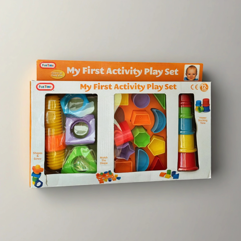 My First Activity Play Set is an engaging educational toy designed for children aged 12 months and above. This multi-coloured set includes a shapes and sorting tray, stacking cups, and various threading and twisting shapes. It enhance hand-eye coordination, colour recognition, motor skills, sorting skills.